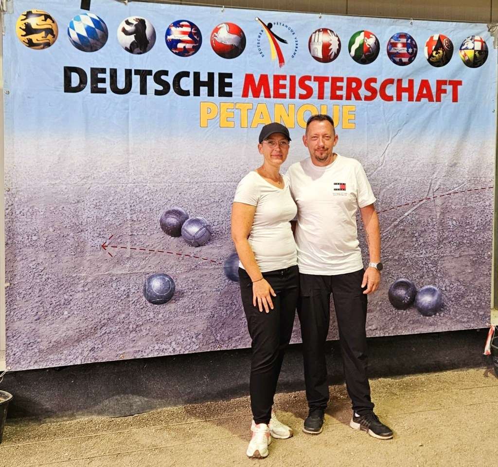 Mit Vorfreude fuhren Marcel und Melanie als NRW 19 am 20.08.24 zur Deutschen Meisterschaft nach Düsseldorf und fanden ein wunderbar vorbereitetes Gelände bei Sur Place vor. 24 Teams aus NRW waren qualifiziert. Es galt den Poule zu überstehen, um einen Setztplatzt für das nächste Jahr zu sichern. Die Wettervorhersage versprach wieder heiße Temperaturen. Leider schafften es die Beiden nicht den Sieg in der Barrage gegen Hess 11 einzufahren. Somit ging es B-Turnier weiter. Dann kamen 3 Siege in Folge und das 4tel Finale war erreicht. Sonntag morgen bei angenehmen Temperaturen standen im A- Turnier die besten 16 Teams ( davon 3 NRW Teams) und in B die besten 8 Teams ( 1 NRW Team) auf dem Platz und kämpfen um den Einzug die nächste Finalrunde. Die Kugel kamen nicht wie gewollt und das Spiel gegen NiSa 09 war mit 6:13 verloren. Platz 5 zu erreichen, auch wenn es im B-Turnier ist, ist schon ein super Ergenbis. Von 7 Spielen, 5 gewonnen. Glückwunsch.