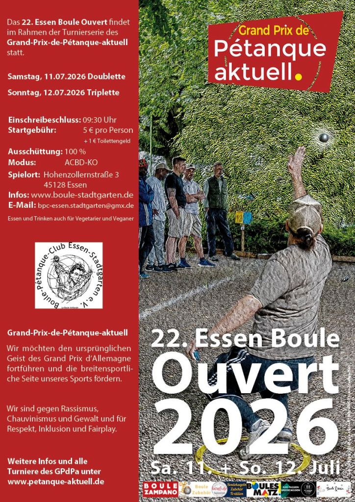 Wir freuen uns, euch auch in diesem Jahr wieder im wunderschönen Essener Stadtgarten zum 22. Essener Boule Ouvert im Rahmen des Grand Prix de Pétanque aktuell begrüßen zu dürfen.